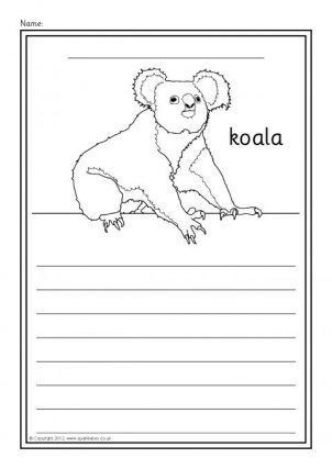 A set of simple printable sheets featuring pictures of various Australian animals for children to colour along with lines for related writing beneath