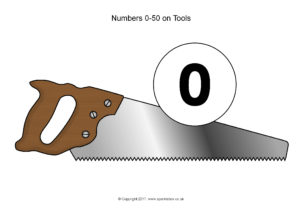 The numbers from 0 to 50 presented on various building site and carpentry tools