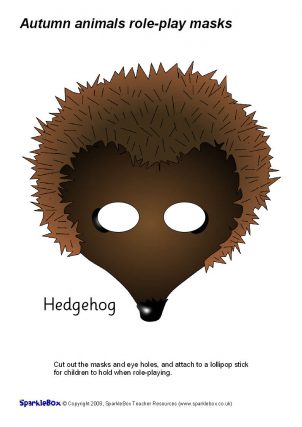 A set of printable cut-out masks with ‘Autumn’ animals: hedgehog, grey squirrel and red squirrel