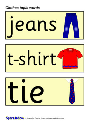 A set of word cards with accompanying pictures linked to a topic on clothes