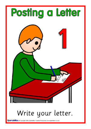A group of simple colour posters showing the process of posting a letter in 5 steps