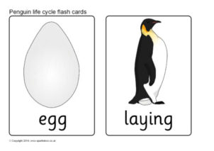 A set of printable flash cards showing the basic stages in the life cycle of a penguin