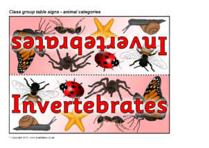 Class group signs featuring the six animal categories: Invertebrates, Mammals, Birds, Fish, Reptiles and Amphibians