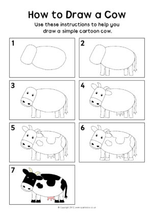 A simple desktop prompt sheet showing step-by-step how to draw a cow