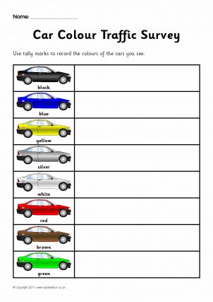Printable worksheets for children to survey the colours of cars passing in traffic or parked around the school