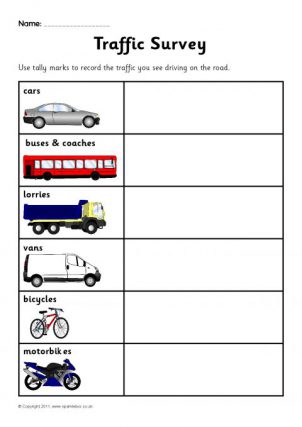 A printable worksheet for children to survey the types of vehicles passing by in traffic on the road