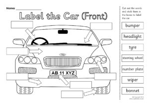 Cut-and-stick worksheets where pupils label the car (front, back and side views), as well as word cards and car pictures for whole-class discussion