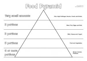 A simple activity including blank food pyramids and food to cut out and stick in the appropriate places