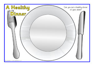 A printable dinner plate with healthy and non-healthy foods for children to cut and stick