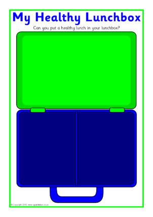 A printable lunchbox with healthy and non-healthy foods for children to cut and stick