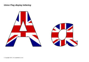 A PDF document with 26 Union Flag-themed alphabet letters (upper and lowercase)
