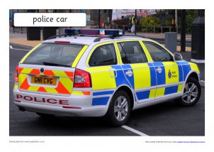 A set of photos of various emergency vehicles such as police car, helicopter, jeep, dinghy and ambulance