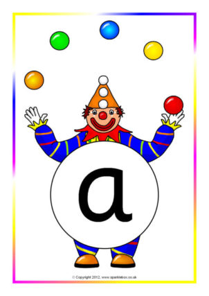 A PDF document with 26 A4-sized clown posters showing the lowercase alphabet letters a-z