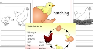 A simple desktop word mat showing the basic life cycle of a hen with associated words.