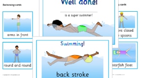 A set of printable resources for use when teaching swimming, or for displaying in your school swimming pool. Includes illustrated activity/challenge cards such as ‘get your face wet’, ‘bob up and down’, ‘back stroke’, ‘go under water’ etc. together with posters that include swimming items as well as actions.