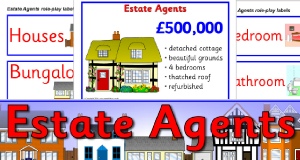 A set of printable signs, posters, labels and writing aids for your Estate Agents role-play area. The set includes a banner , ‘Property information’ form, labels and property information posters.