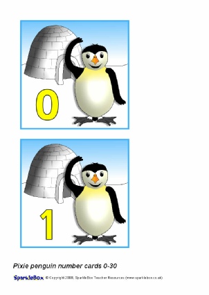 Multi-use printable cards featuring penguins a fun penguin character with the numbers from 0 to 30. Each card is 15cm by 15cm and can be used for all sorts of card-based activities.