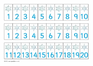 A PDF document with printable snowflake-themed number tracks. 1-10, 11-20 and full 1-20 tracks.