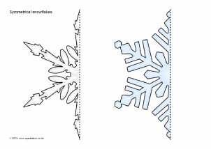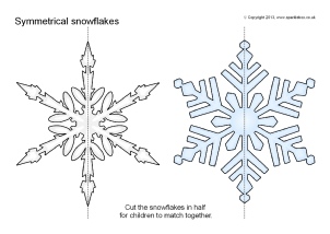 A set of symmetrical snowflakes that can be cut in half for children to match the halves together.